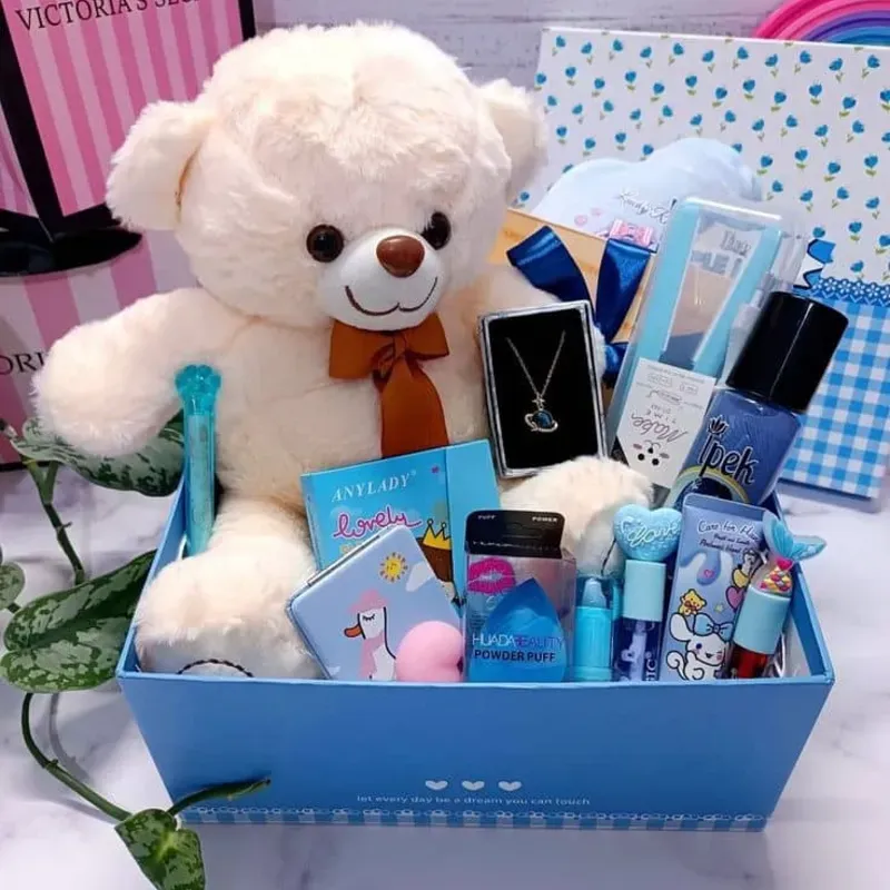 Incluye: Un peluche grande Una cadena de oro laminado Un cepillo eléctrico (alisa, seca y plancha) Una colonia Una paleta de 12 sombras que incluye corrector y contorno Un cosmético de 18 colores Una esponja de maquillaje Un creyon Un gloss Una tinta Una gelatina capilar Una paleta que exfolia y aplica mascarilla Una mascarilla facial de velo o peel off