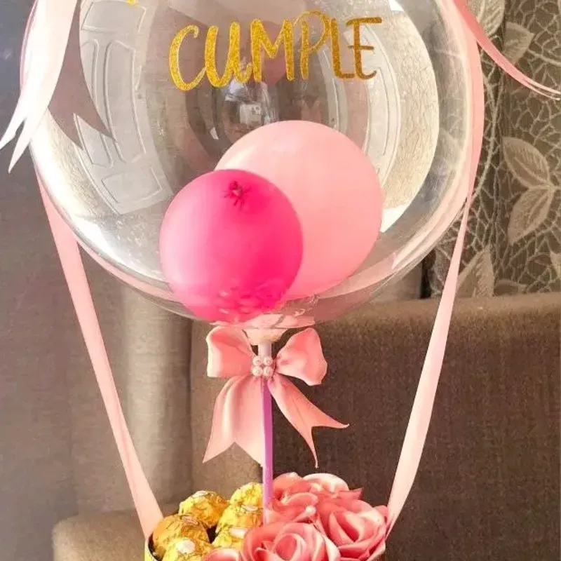 Regalo con bombones ,rosas eternas y globo burbuja. Usted elige el color que desee