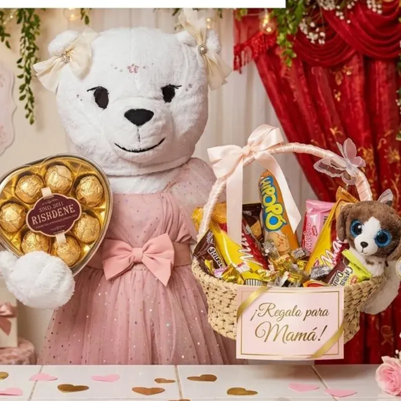 Cesta con variadas confituras ,caja de bombones,peluche y animación incluida
