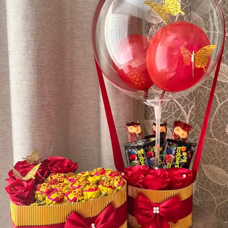 Corazón con bombones y cesta con rosas eternas ,globo burbuja y confituras