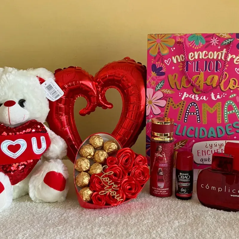 Peluche ,caja de corqzon con arreglo de rosas eternas y bombones ,colonia ,perfume ,desodorante ,globo y jabita de la temática para mamá .