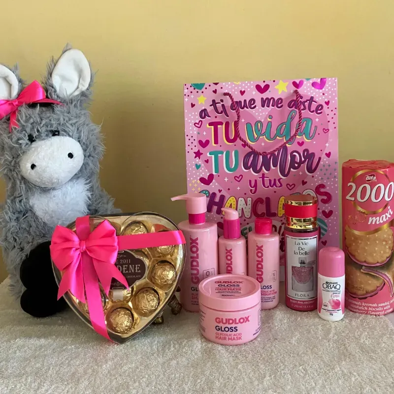 Peluche grande ,caja de bombones ,juego de shampoo variado para la belleza femenina ,colonia ,desodorante ,paquete de galletas dulces grande y jabita temática mamá .