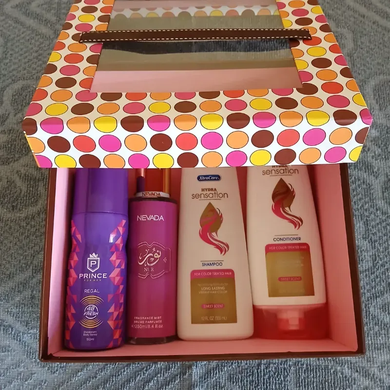 Contiene un shampoo, acondicionador ,colonia ,desodorante spray.