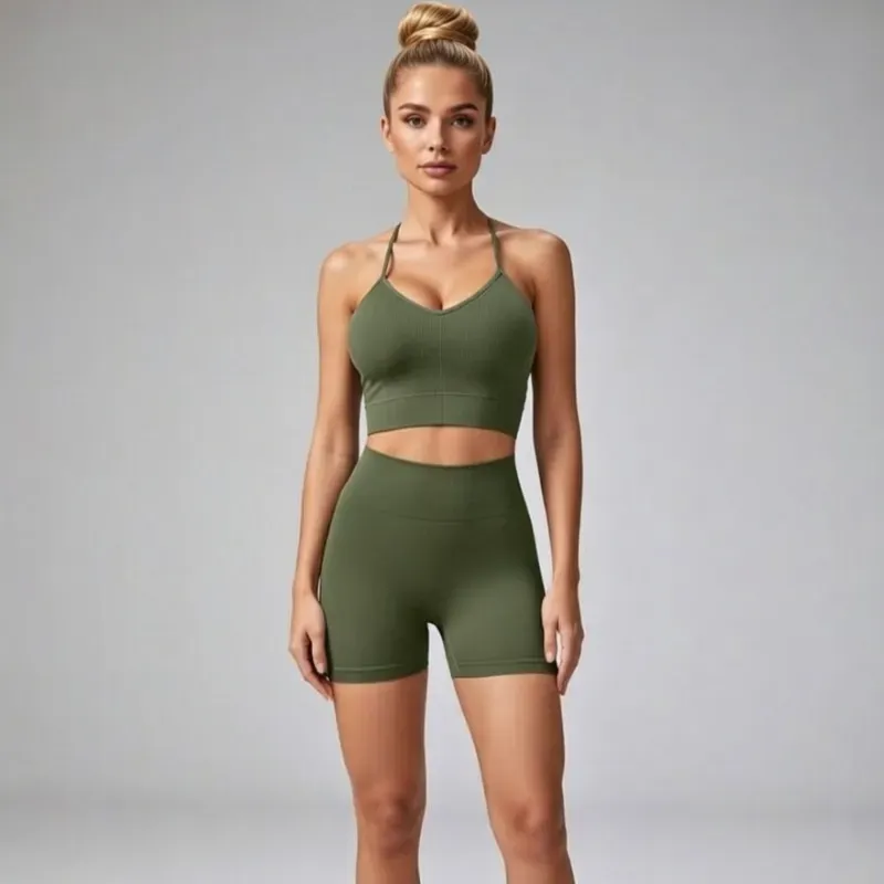 Set deportivo de tela firme, elastizada que permite el libre movimiento. Se ajusta a la piel sin dejar transparencias. Efecto levanta glúteos.