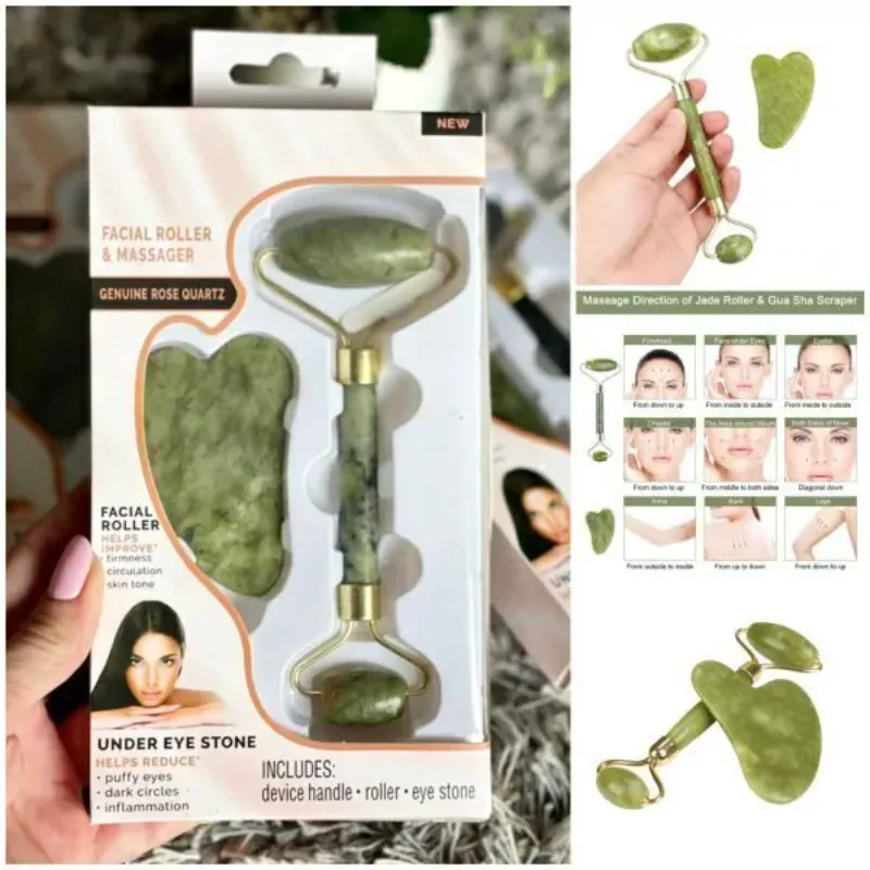 Rodillo de jade "Reduce las arrugas y finas líneas de expresión, calma las rojeces y estimula el drenaje linfático, al tiempo que reduce la inflamación y mejora la elasticidad de la piel", La piedra gua sha Su función es la de favorecer el drenaje linfático, y estimular la circulación del músculo. Bien utilizadas, estas herramientas movilizan la linfa y, por lo tanto, disminuyen los volúmenes e inflamaciones, ayudan a eliminar toxinas acumuladas, mejorar la microcirculación y, en general, el aspecto de la piel.