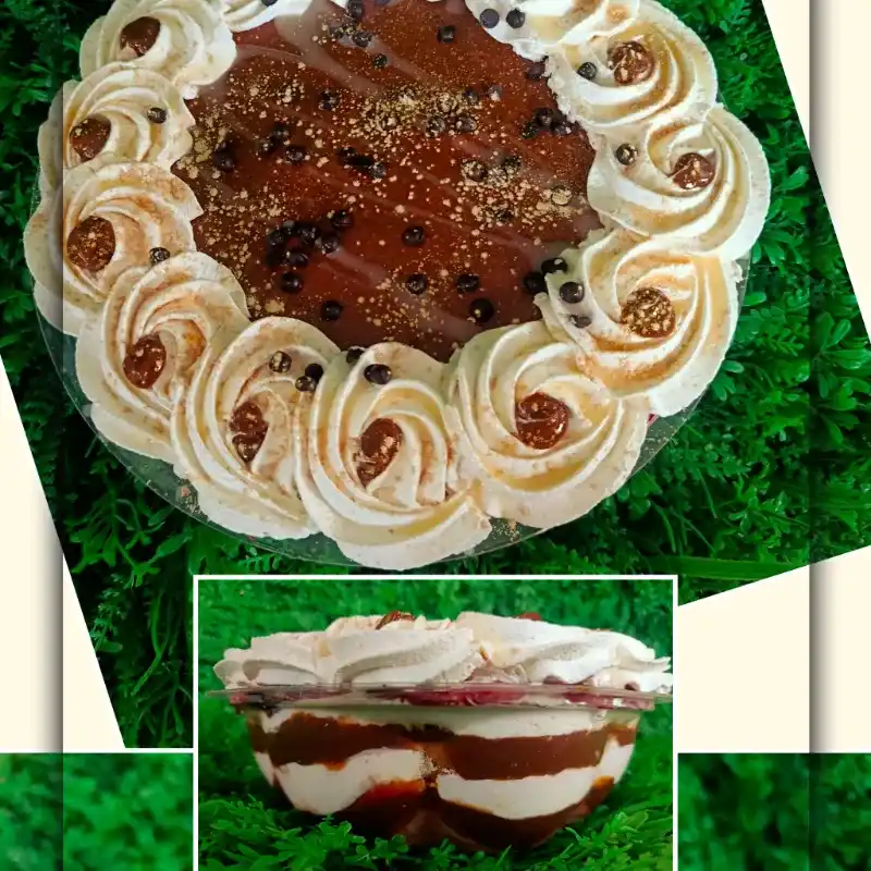 Cacherola tres leches de 29 cm con relleno de crema de mantequilla, dulce de leche, apollo de frambuesa, chispas bombones, decorado con crema de mantequilla y una capa dé cobertura de chocolate 🍫🤤