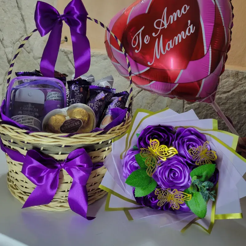 Cesta con confituras, set de aseo, ramo de flores eternas, globo temático.