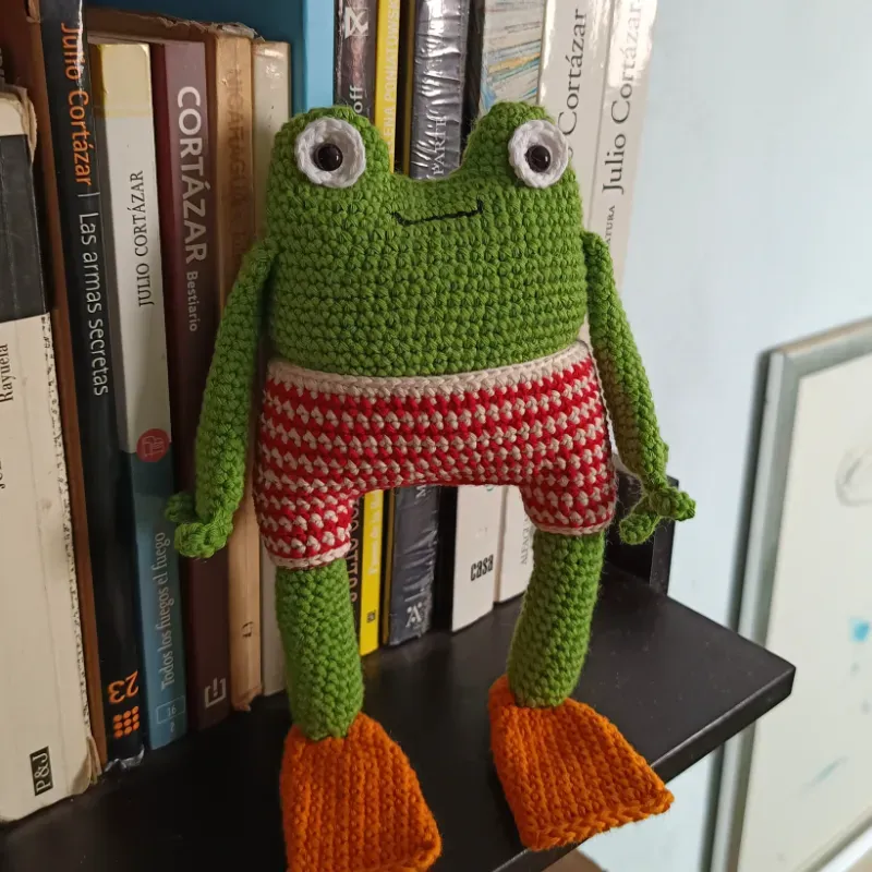 Victor es una rana que tiene un look fresco y simpático. Se puso su bañador para ir a la playa. Este amigurumi es uno de los 20 patrones perteneciente al libro La Banda de Pica Pau 1 de Yan Schenkel, una diseñadora de muñecos de ganchillo argentina.