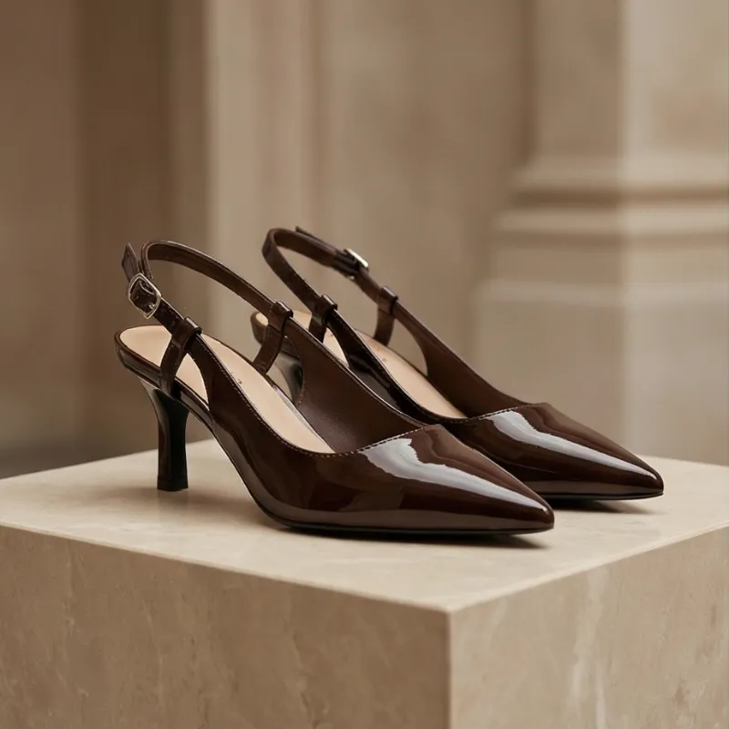 Tacones marrón oscuro, minimalistas y perfectos para outfits formales.