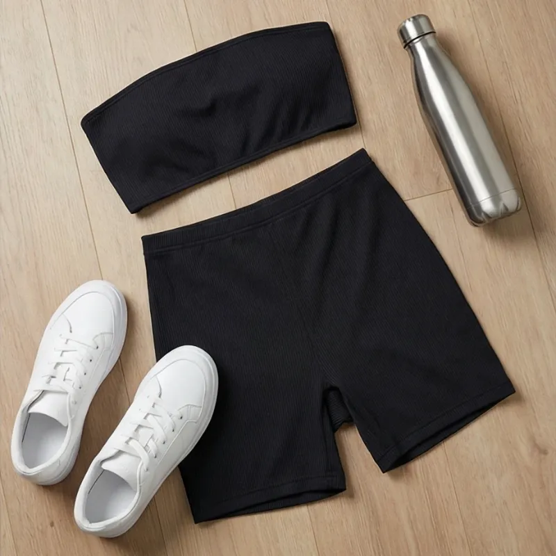 Set deportivo negro con top bandeau y biker shorts. Minimalista y versátil