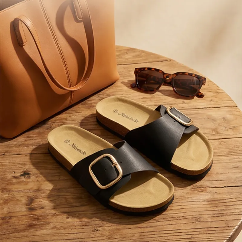 Sandalias negras minimalistas con hebilla grande, súper cómodas
