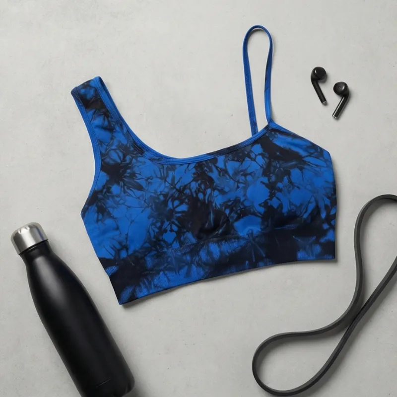 Top deportivo azul con estampado moderno. Soporte ligero y ajuste cómodo para gym o uso diario