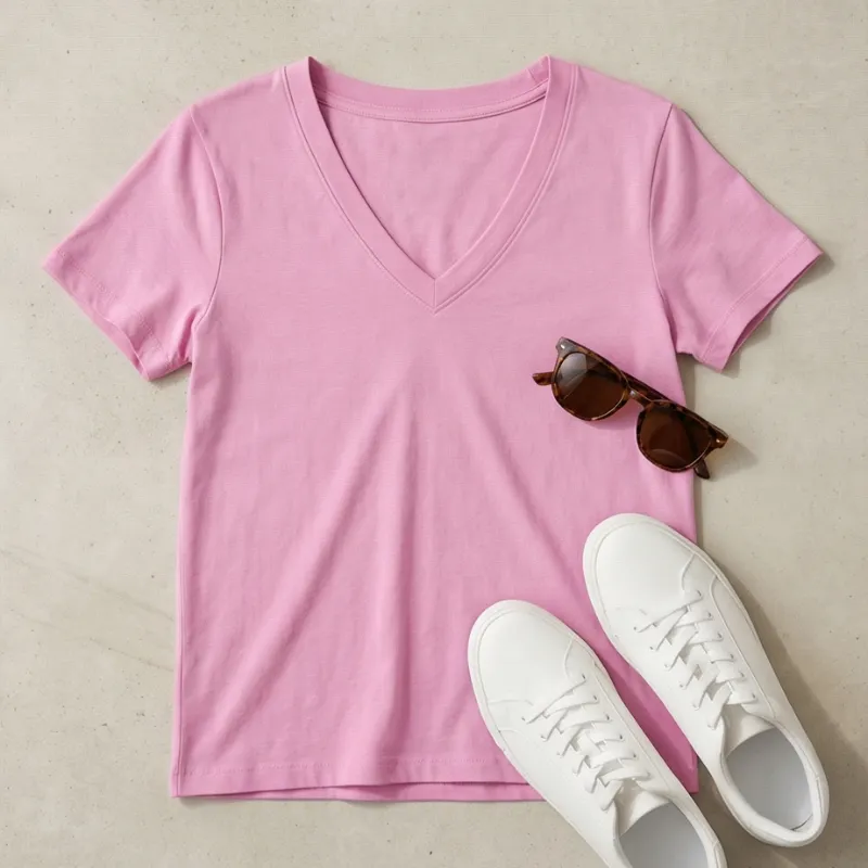 Clásica camiseta en tono rosado con diseño limpio. Perfecta para outfits suaves y femeninos