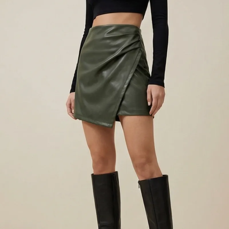 Falda short en tono verde con acabado tipo cuero, diseño cruzado que estiliza la figura. Moderna, sexy y perfecta para outfits de noche o casual chic.