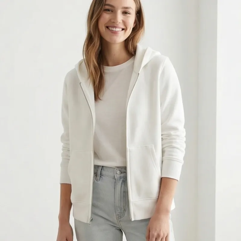 Hoodie blanco con cierre, estilo limpio y cómodo. Ideal para outfits casuales con un toque chic.