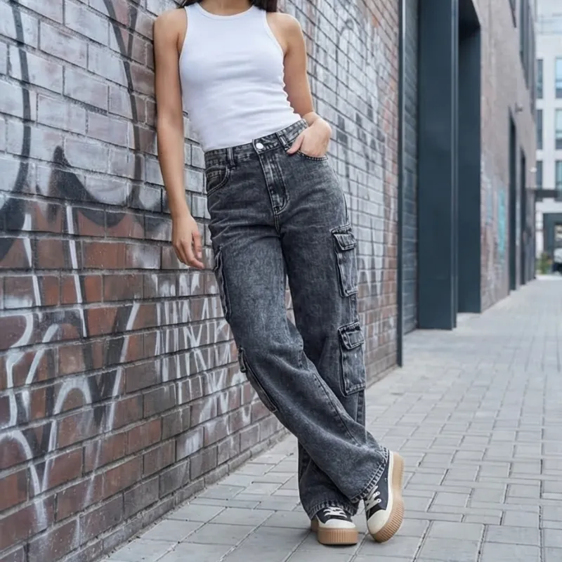 Jean gris con bolsillos tipo cargo, estilo urbano y moderno. Ideal para looks relajados y con flow.