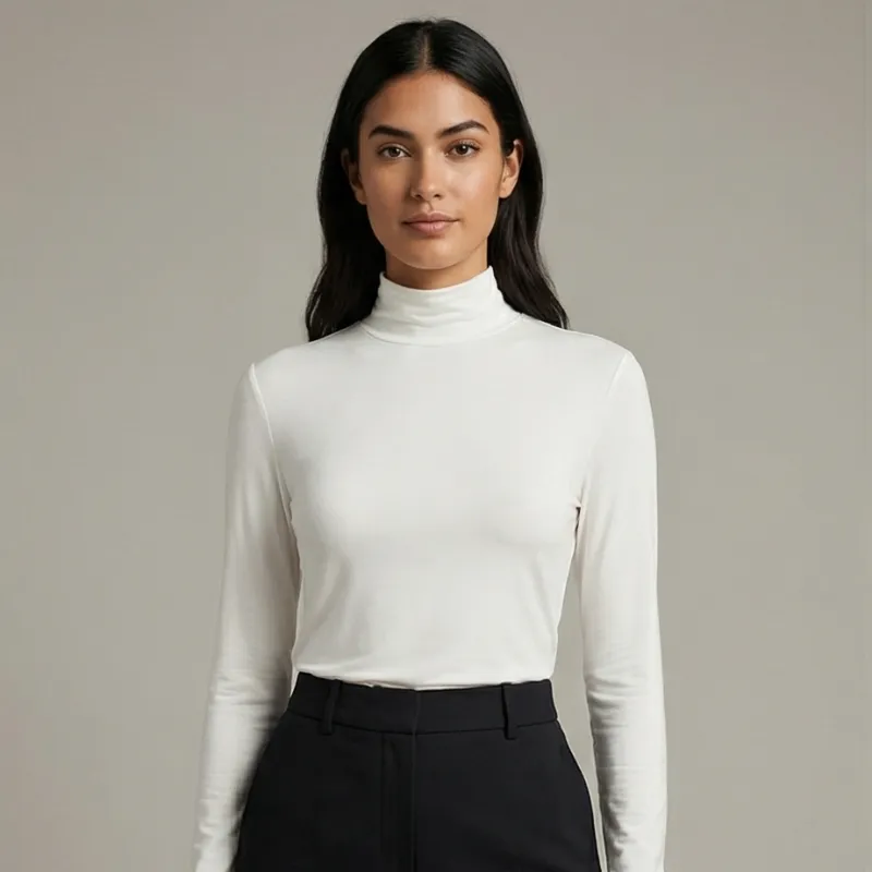 Top blanco cuello alto, suave y versátil. Perfecto para looks minimalistas y elegantes.