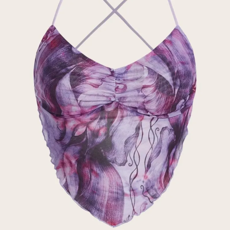 Top femenino con print en tonos lila y rosado, tirantes finos cruzados y ajuste ligero. Perfecto para un look fresco y chic ✨