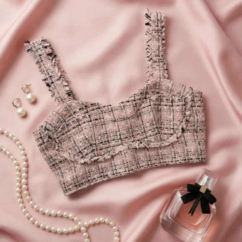 Top corto con tirantes en tela tipo tweed, delicado y elegante. Perfecto para looks classy con un toque femenino. Ideal para combinar con pantalones o faldas altas.