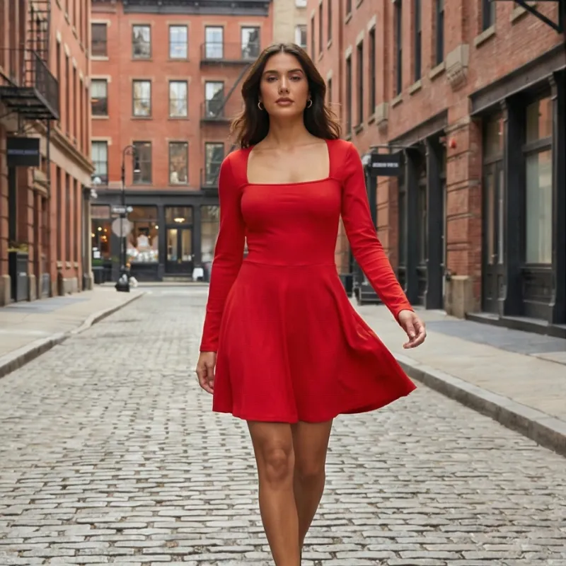 Vestido con falda amplia y mangas largas que estiliza la figura. Elegante y cómodo, ideal para cualquier ocasión especial