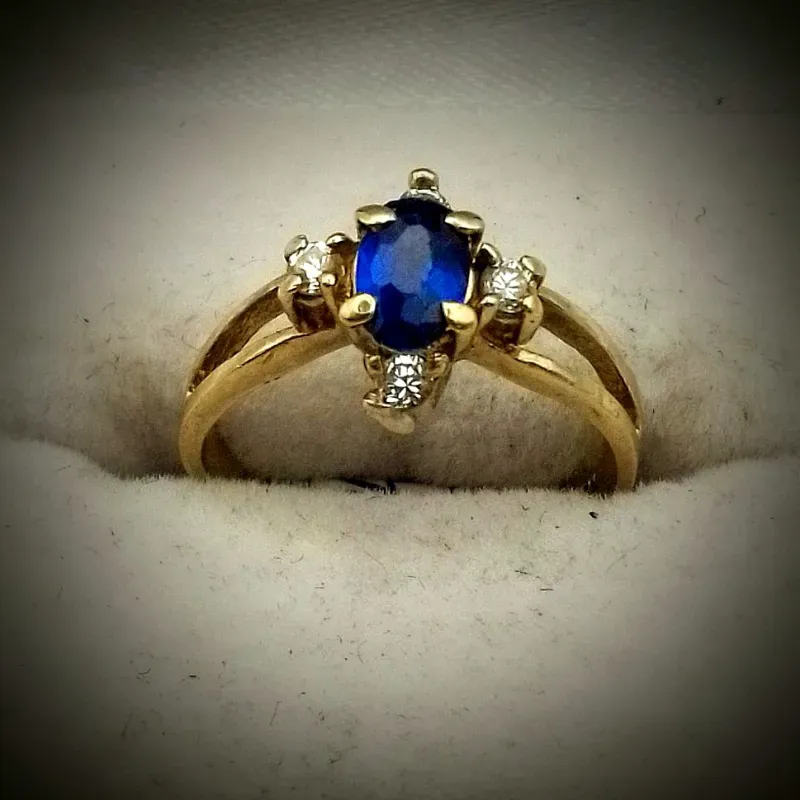 Anillo Original 10K En Forma de Flor Con Gemas Blancas y Azúl Combinada es talla 5-3/4