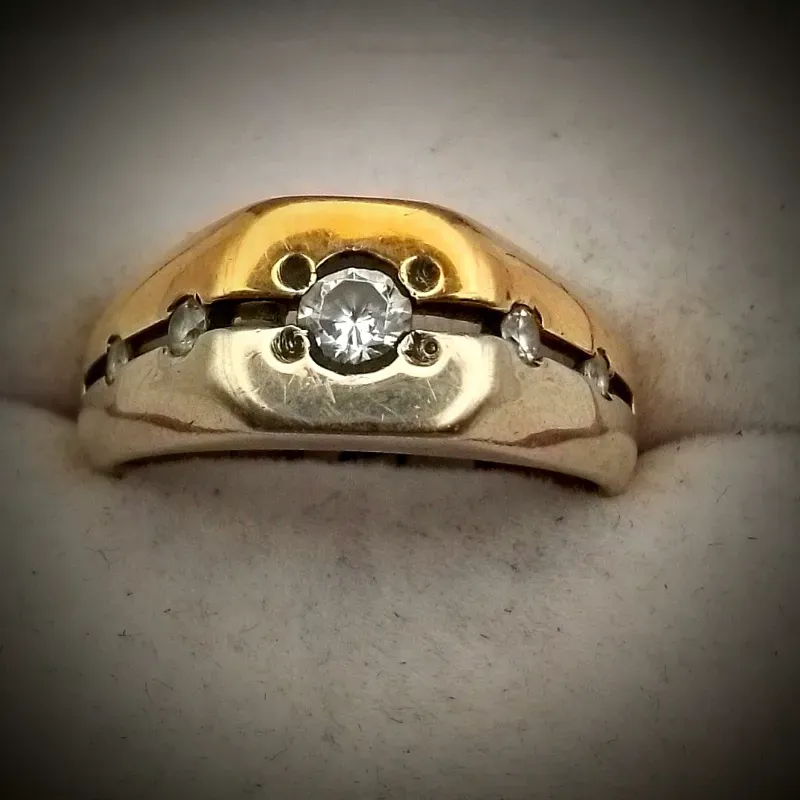 Anillo mitad oro blanco y amarillo separados por circones blanco