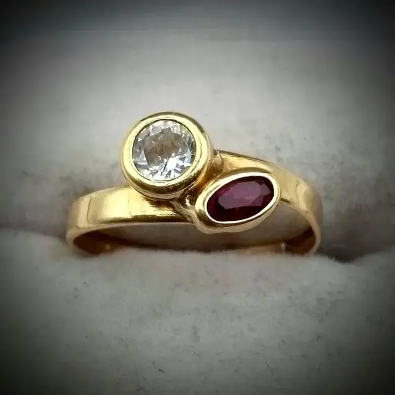 Anillo Original 18K Sencillo con dos Gemas Blanca y Roja es talla 6 y medio