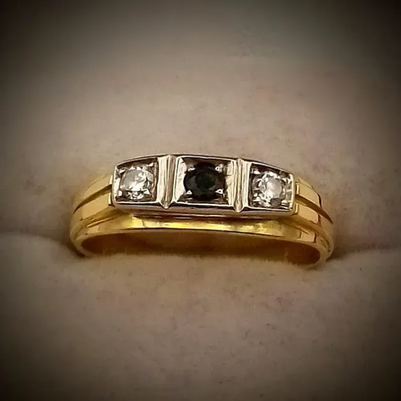 Anillo Original 18K Tresillo Fuerte Con dos Brillantes 0.04 y Esmeralda es talla 9 y medio