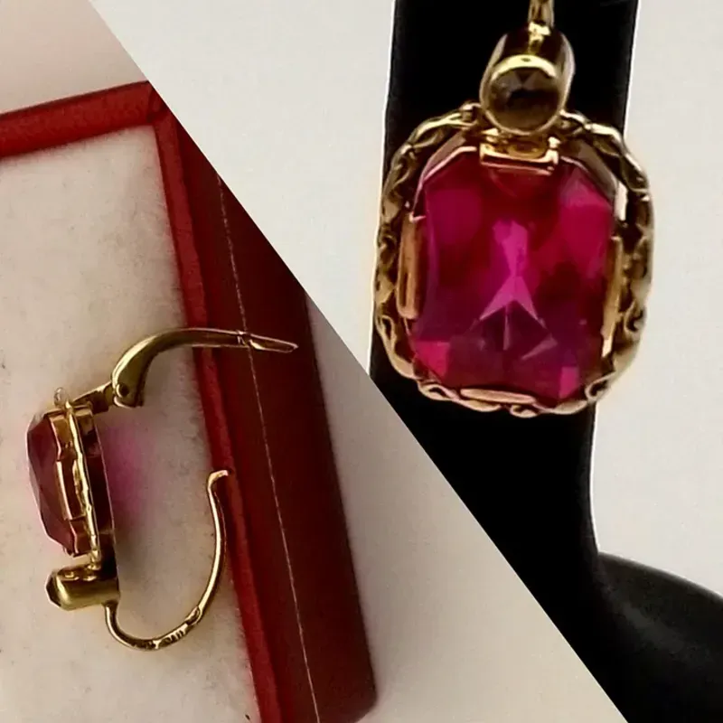 Aretes originales 14K colgantes con circón rojo cuadrado mide de largo 5 cm poseen cierre romano