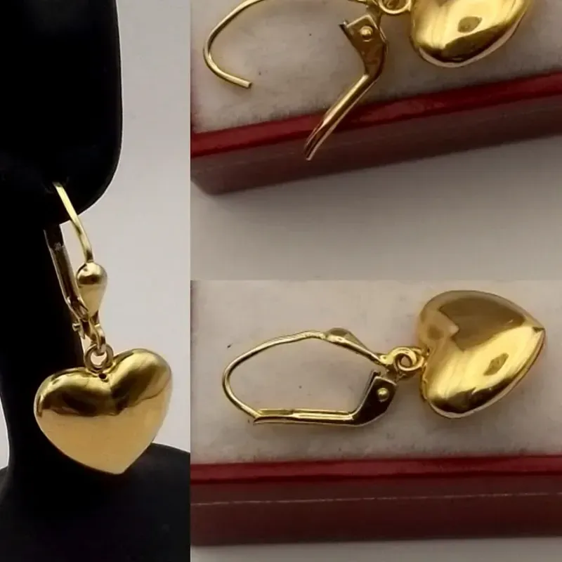 Aretes originales 14K colgantes de corazón con volumen posee cierre romano mide 4 cm de largo