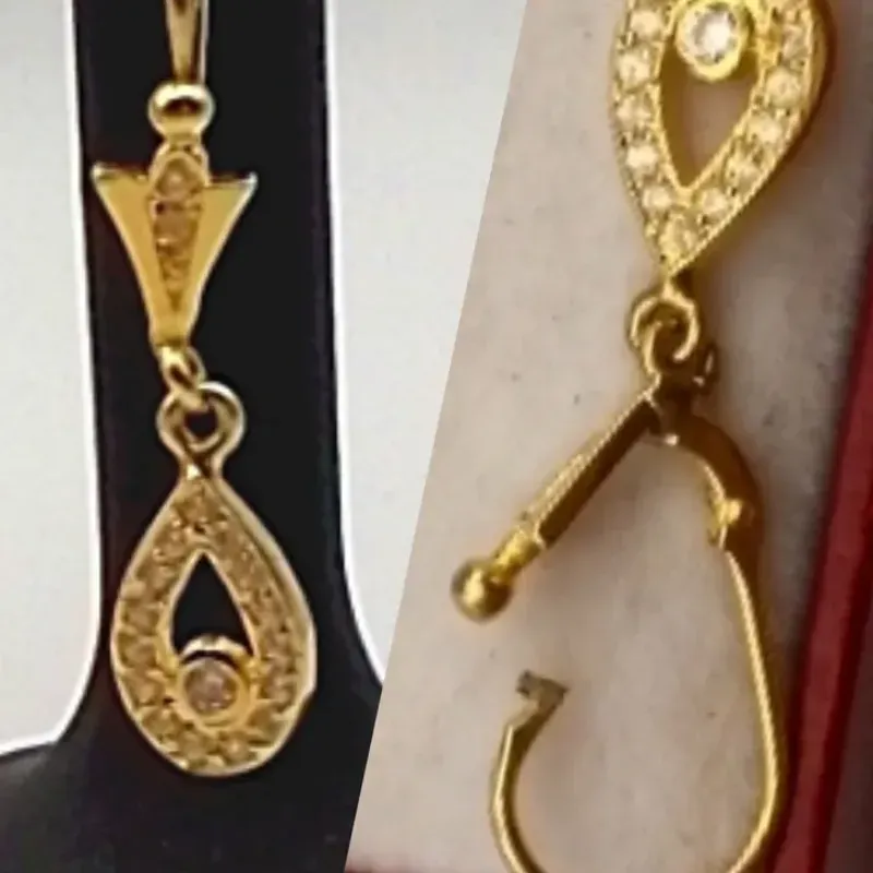 Aretes colgantes punta de flecha como una gota con circones originales 18K mide de largo 4.5 cm y tiene cierre romano