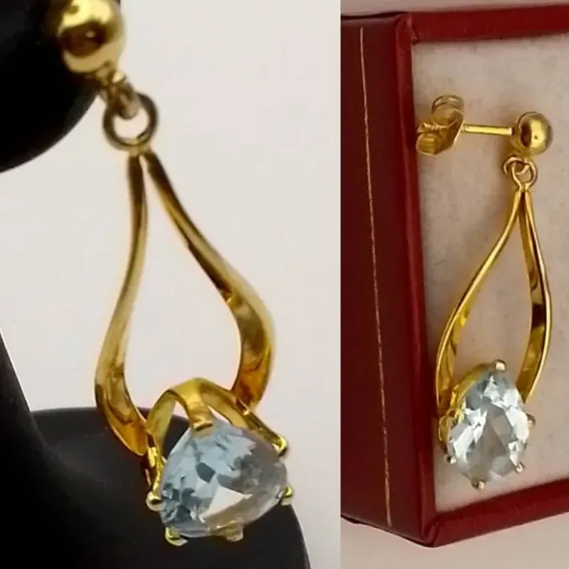 Arete Originales 14K Exclusivos Colgantes Con una Almendra de Agua Marina mide de largo 3 cm y de ancho 1 cm posee cierre de mariposa a presión