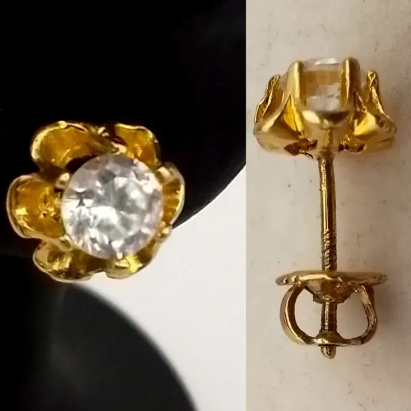 Aretes pegados originales 18K forma de flor con un circón blanco y tiene cierre de rosca
