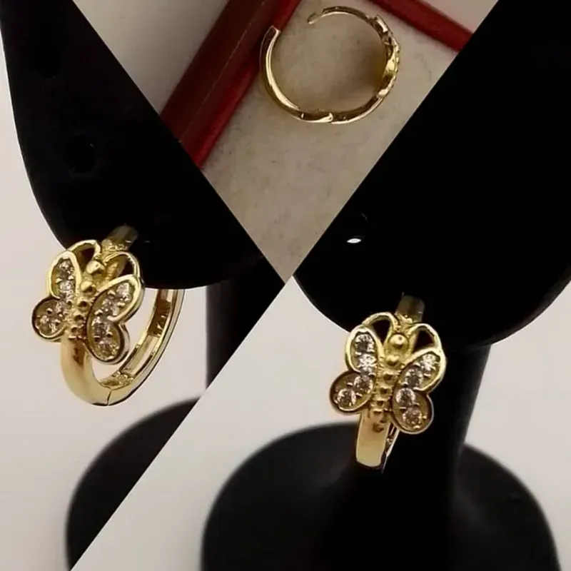 Argollas Originales 14K Con Mariposa Con Circones Blancos poseen cierre Romano mide de largo 1.6 cm y de ancho 1.6 cm