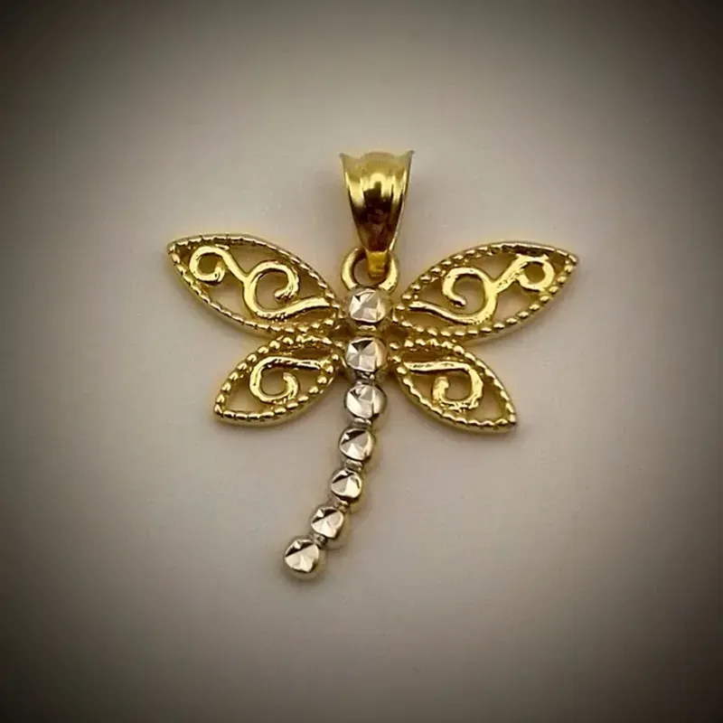 Dije Original 14K en forma de Libélula con la cola con circones redondos blancos mide de largo 2.9 cm y de ancho 2.9 cm