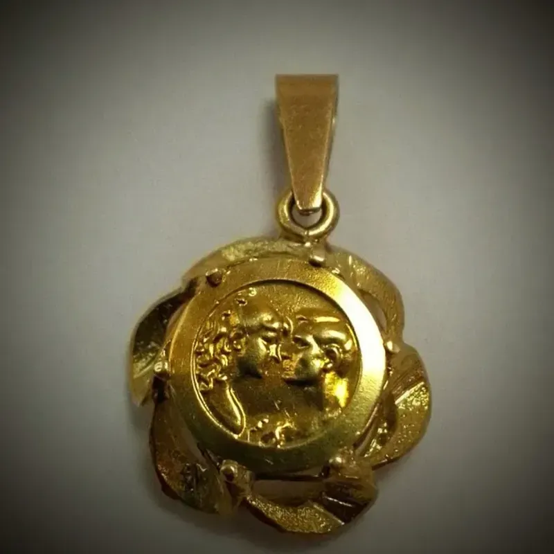 Dije original 18 k en forma de flor y en el medio imagen de 2 cara de ángeles mirándose entre ellos, dimensiones 2.3 cm y ancho 1.6 cm