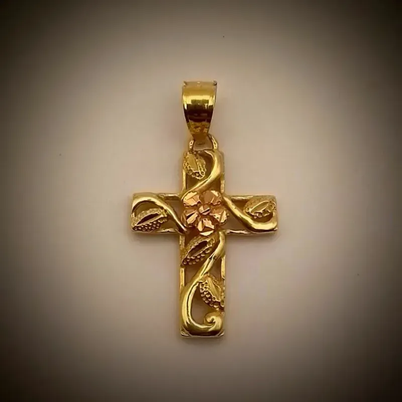 Dije Forma de Crucifijo Calado Con Flor de Oro Rosa en el Medio Entrelazados