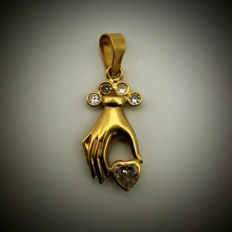 Dije original 18 k con una mano agarrando un brillante dimensiones largo 2.5 cm y ancho 1.1 cm