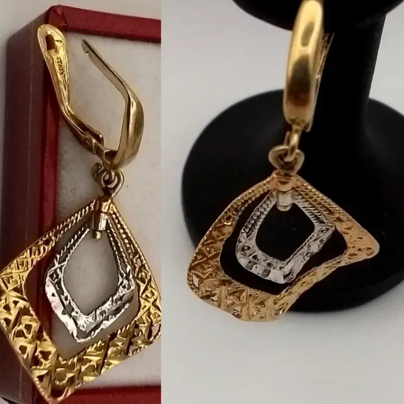 Aretes originales 10K colgante con oro blanco y amarillo mide de largo 4.5 cm y poseen cierre catalán
