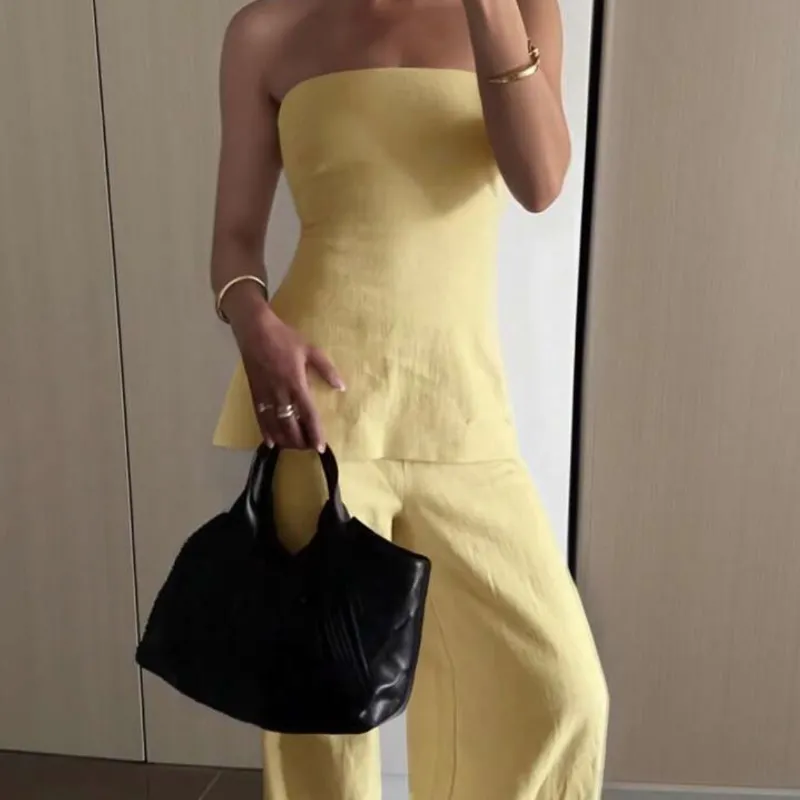 Set de 2 piezas top sin hombros y pantalones unicolor