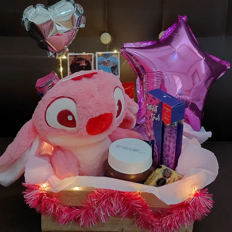 Caja de madera con peluche y luces