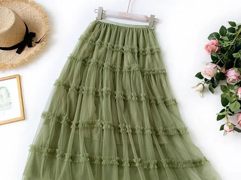 Falda tobillera en gasa plisada. Modelo de corte holgado con cintura elástica y bajo sobrehilado con aberturas laterales. Enagua corta de satén