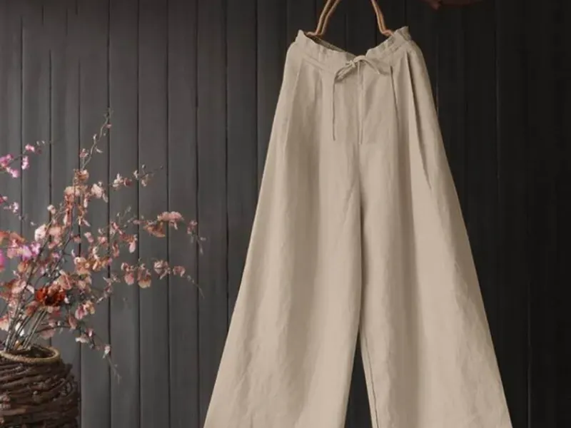 Pantalón elegante de corte holgado en tejido plano con pliegues delanteros. Cintura alta con elástico oculto y cierre de cremallera. Bolsillos laterales diagonales, bolsillos traseros simulados de ojal y perneras rectas y anchas.