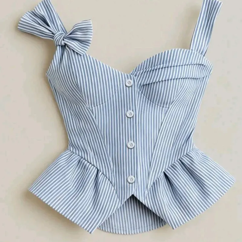 Camiseta corta con volantes en el bajo, tirantes con lazo y rayas azules y blancas