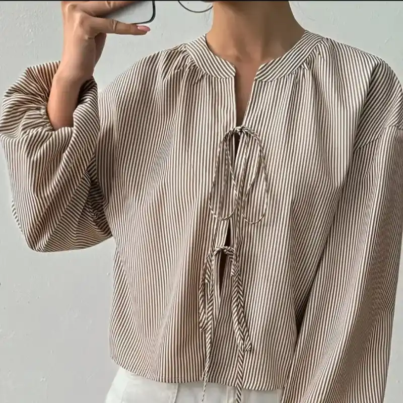 Camisa de mujer casual, elegante, de vacaciones, con lazo a rayas.