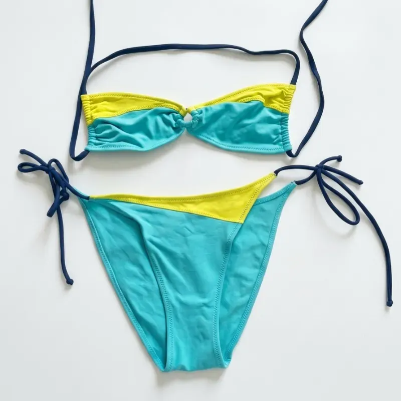 Diseño con contraste perfecto entre el turquesa vibrante y el amarillo solar para resaltar tu bronceado.