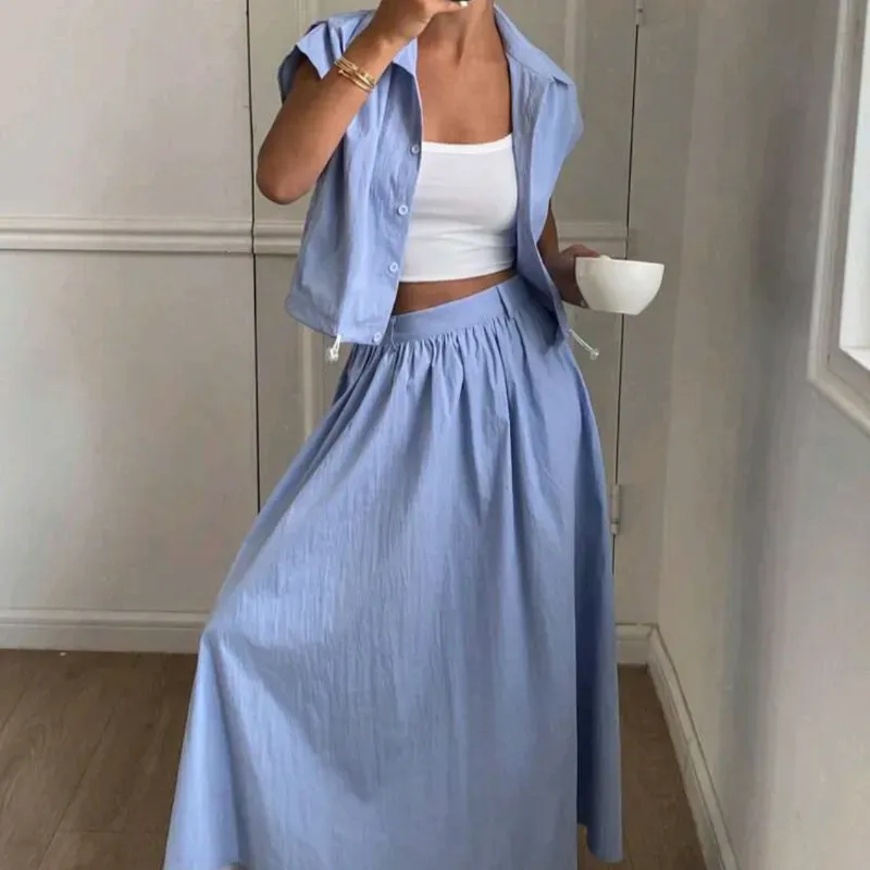 Set de camisa corta y falda de unicolor para mujer.