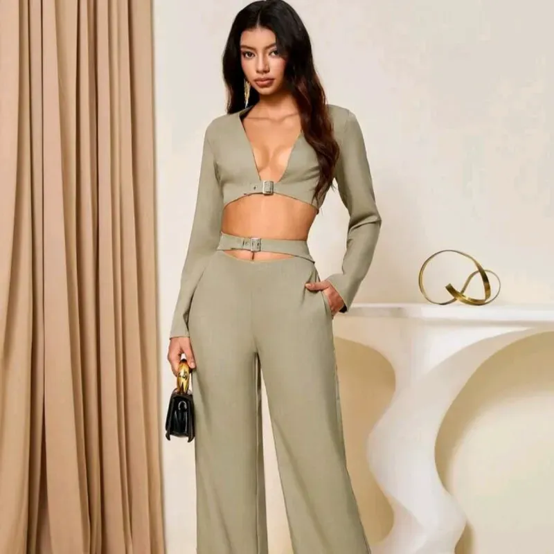 Conjunto de 2 piezas con top de manga larga calado y pantalones rectos holgados con nudo asimétrico en la cintura para mujer