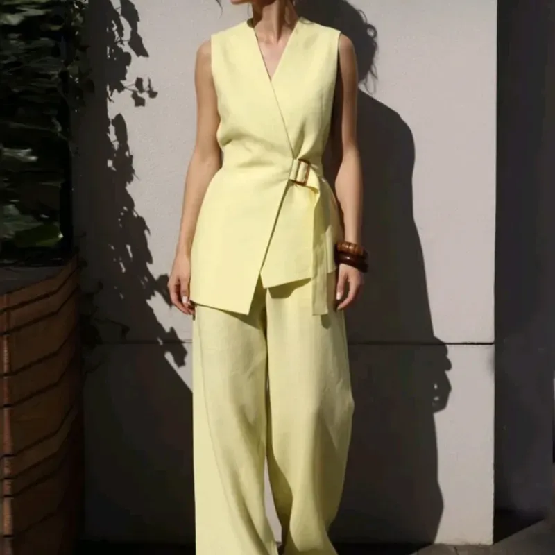 Conjunto de ropa elegante, Blusa sin mangas con cuello en V y corbata en la cintura y Pantalones anchos de pierna ancha con bolsillos para mujer.