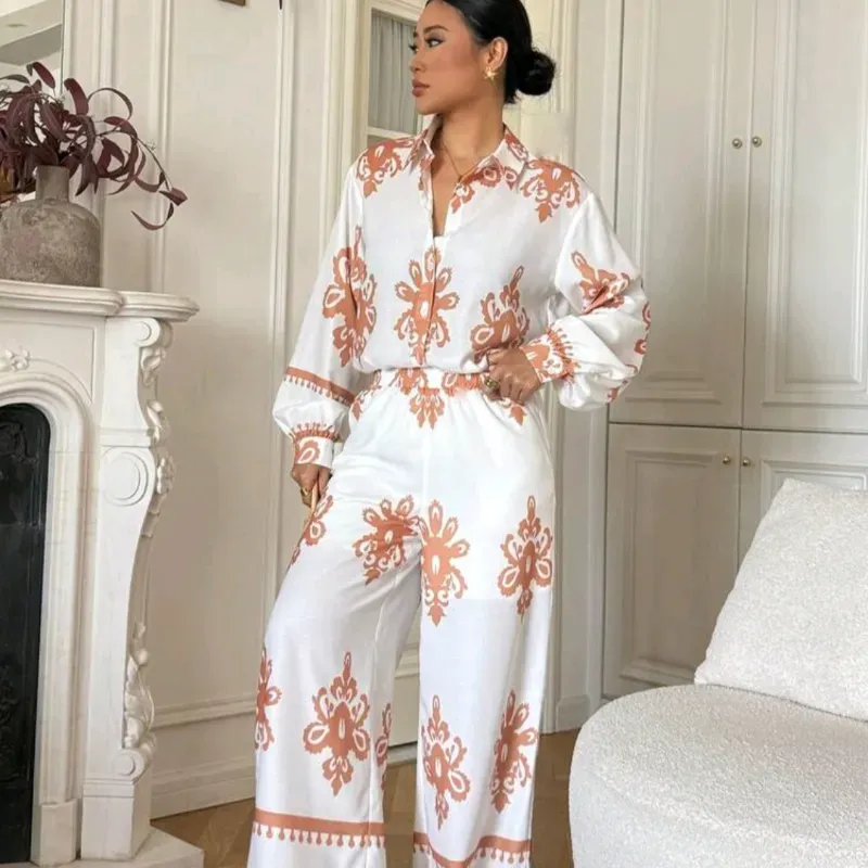 Conjunto de 2 piezas de camisa de manga farol con estampado retro casual y pantalones de pierna ancha para mujer, vestido de invitada de boda para primavera/verano
